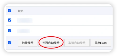 5、全选域名,或者选择需要开通自费的域名,然后点击「开通自动续费」按钮。
